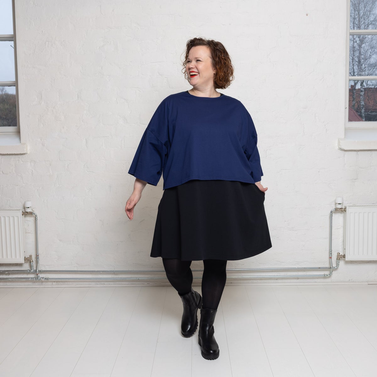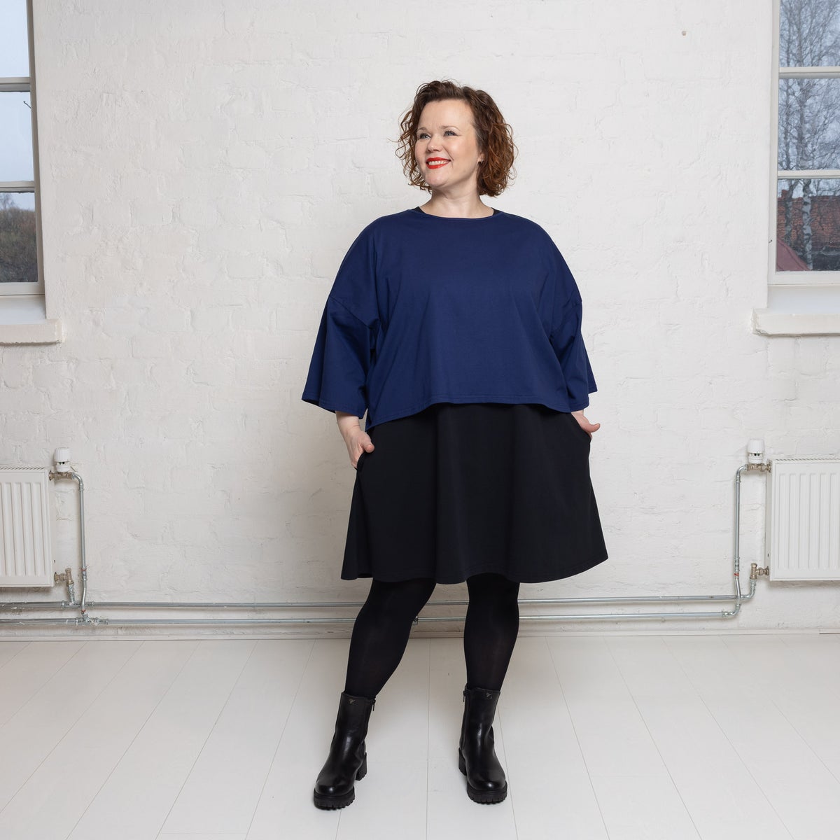 Kaija on kaikkien kaveri! Tämä paita on suunniteltu överi isoksi ja väljäksi, siksi sen nimikin on "kaiken päälle paita". Oversize paidan voi pukea mekon päälle tai hameen kaveriksi. Tämä helmapituus on mallattu toimivaksi varsinkin mekkojen kanssa, kädet mahtuu taskuun ja mittasuhteet toimii.